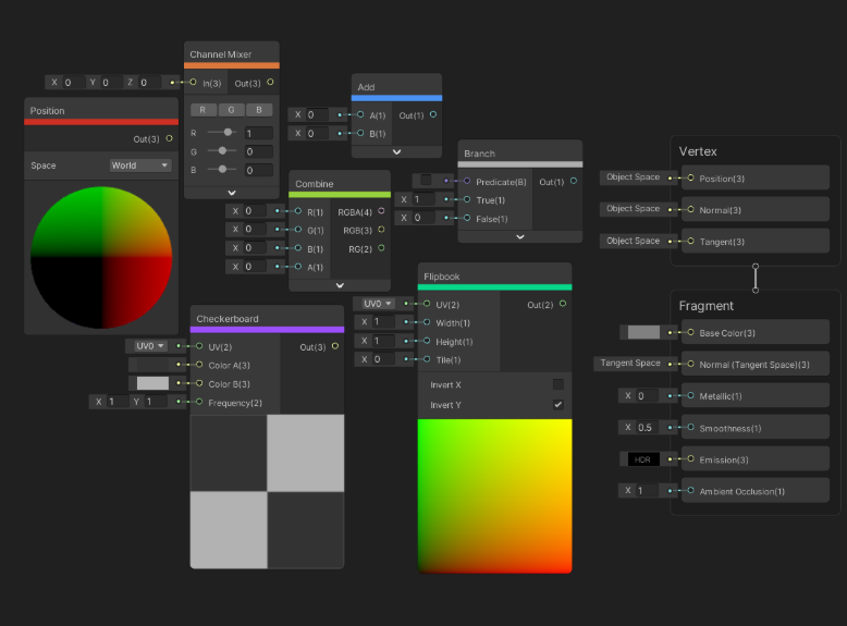 아래 사진처럼 노드와 엣지를 이용한 그래프 형태로 셰이더를 구성할 수도 있습니다.