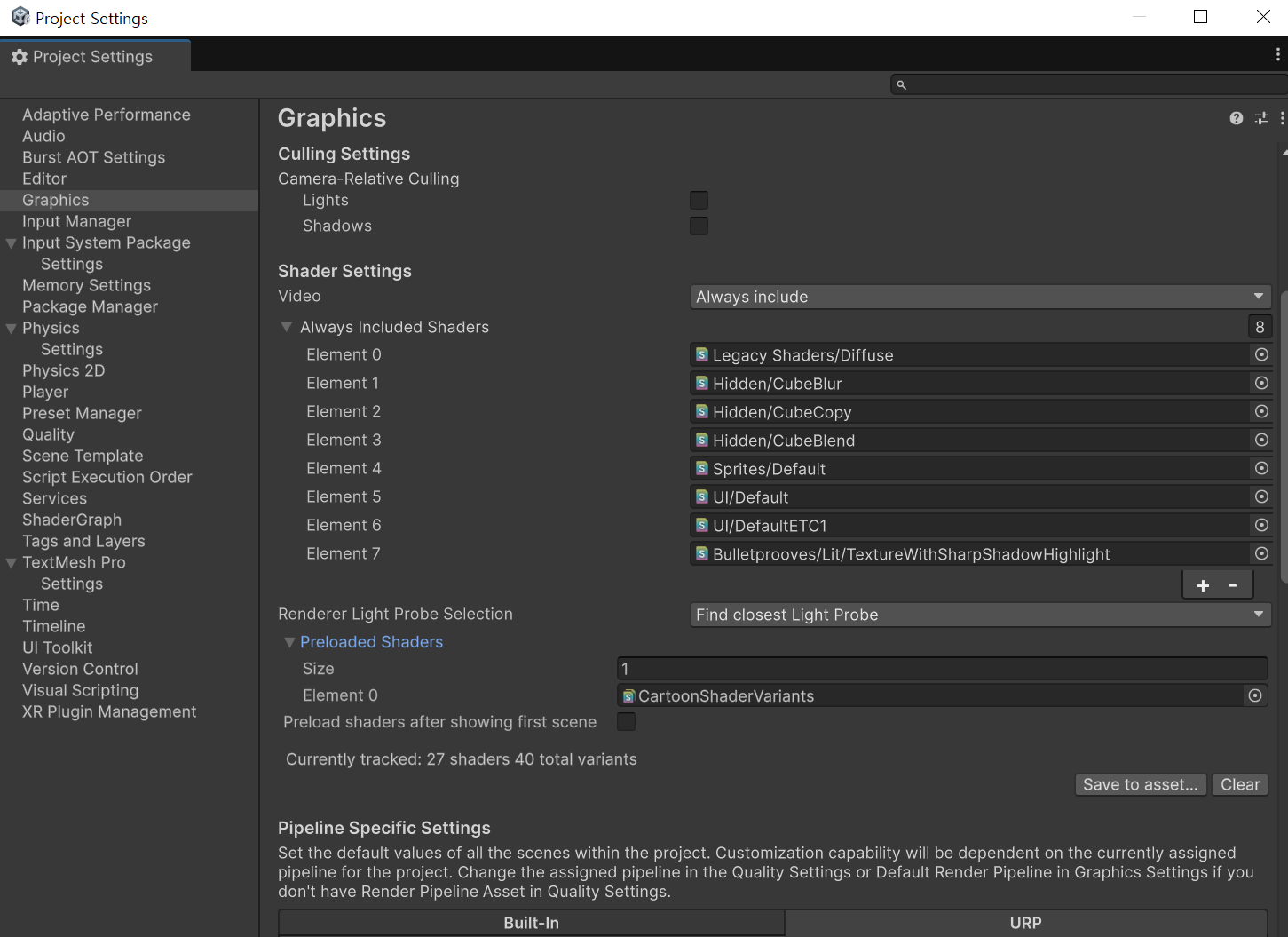 아래 사진과 같이 Preloaded Shaders에 Shader Variants 요소를 추가하고,
