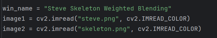 image1, 2 : 필요한 이미지 2개 (steve.png, skeleton.png)를 IMREAD_COLOR 키워드로 읽어옵니다.