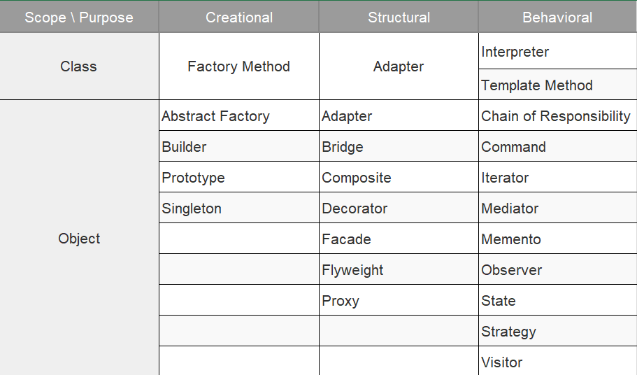 분류 범위와 목적에 따라, Scope (클래스와 오브젝트) 와 Purpose 로 분류된 건 아래 표와 같습니다.
